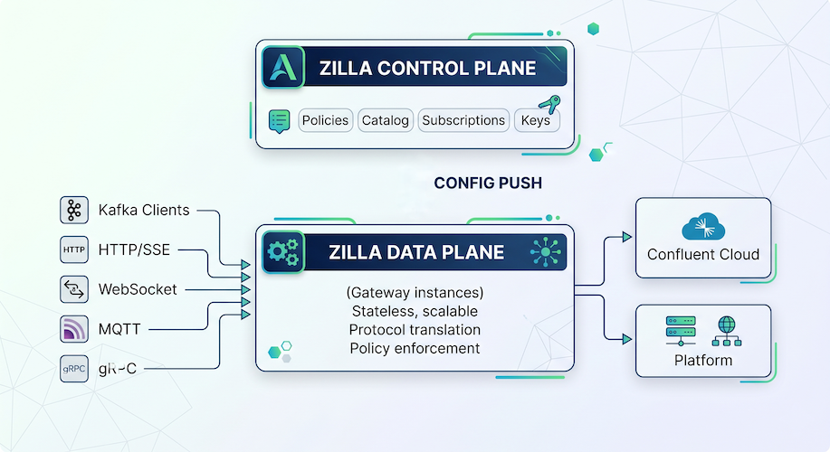 Data Plane — Zilla Gateway, a high-performance stateless proxy that handles protocol translation, security enforcement, policy execution, and streaming message delivery between clients and Kafka.
